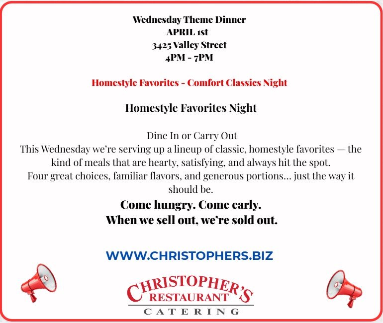 Dine In or Carry OutThis Wednesday we’re serving up a lineup of classic, homestyle favorites — the kind of meals that are hearty, satisfying, and always hit the spot.